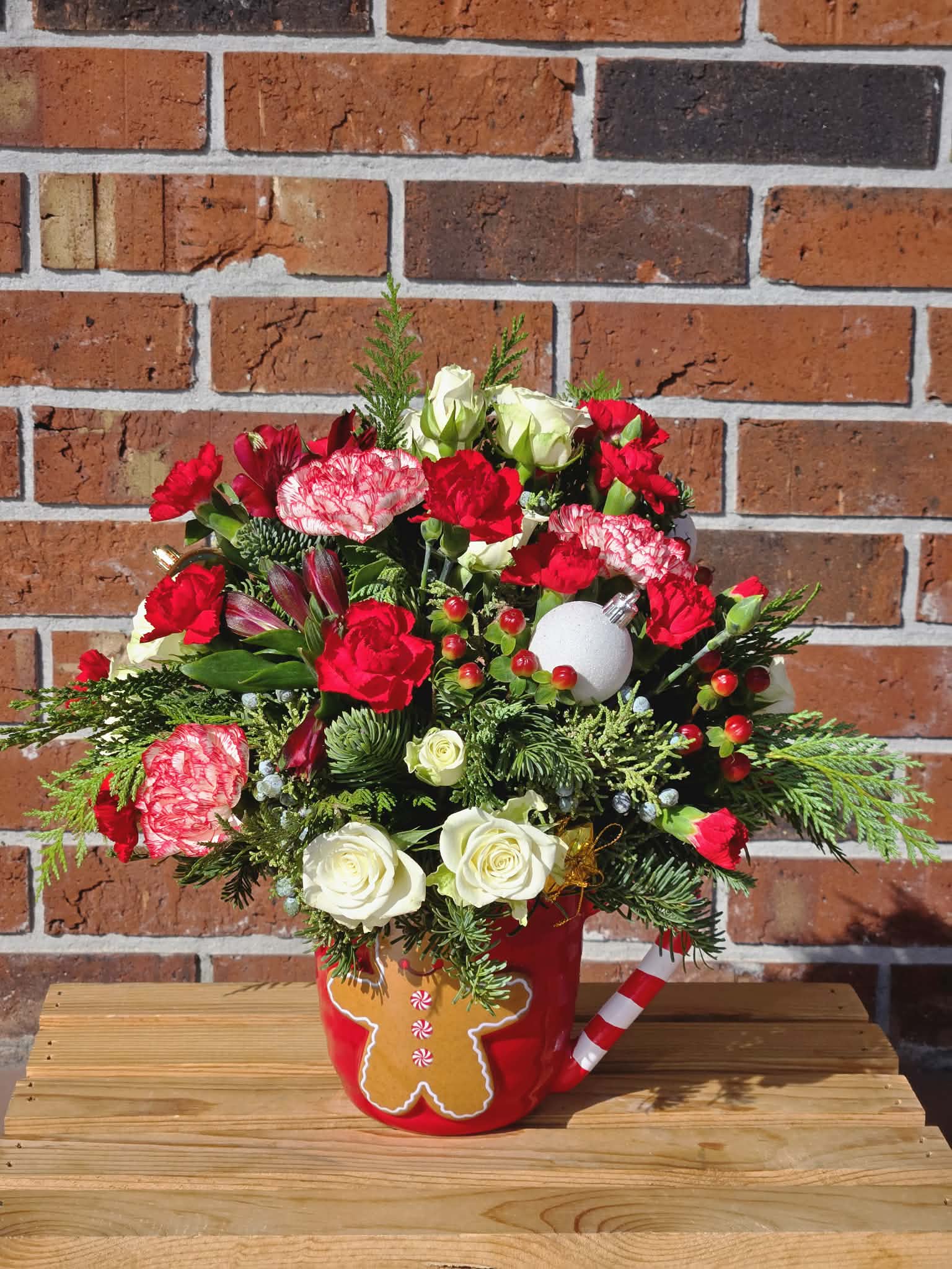Tis the season of Cozy. Grab your mug and the cookies and lets cuddle up to watch Christmas movies. *Please Note* Flowers may Include: White Spray Roses Red Carnations Candy Cane Carnations Hypericum Berries Red Alstroemeria Mixed Holiday Greenery Mixed Standard Greenery The color and style of the arrangement may...