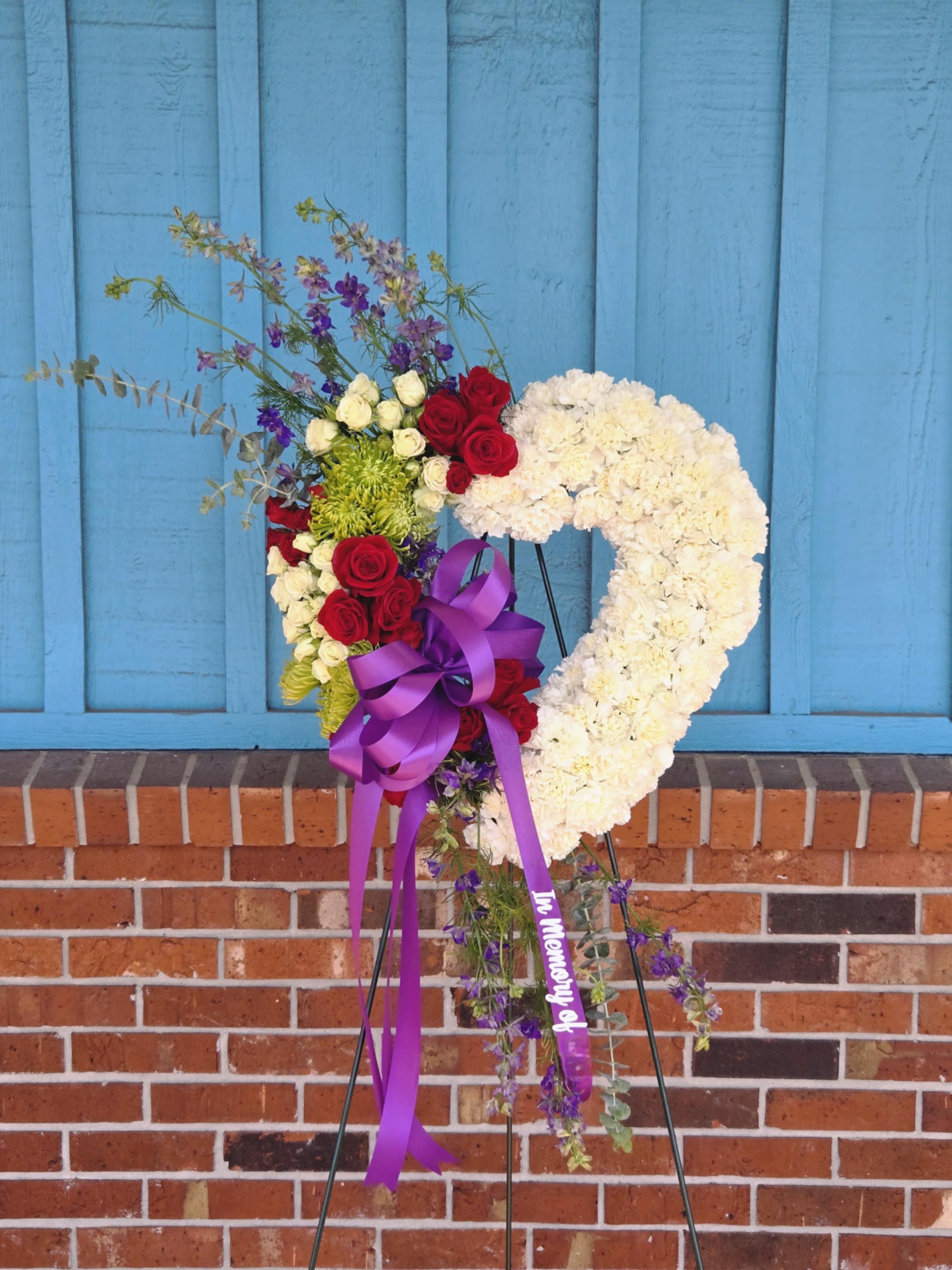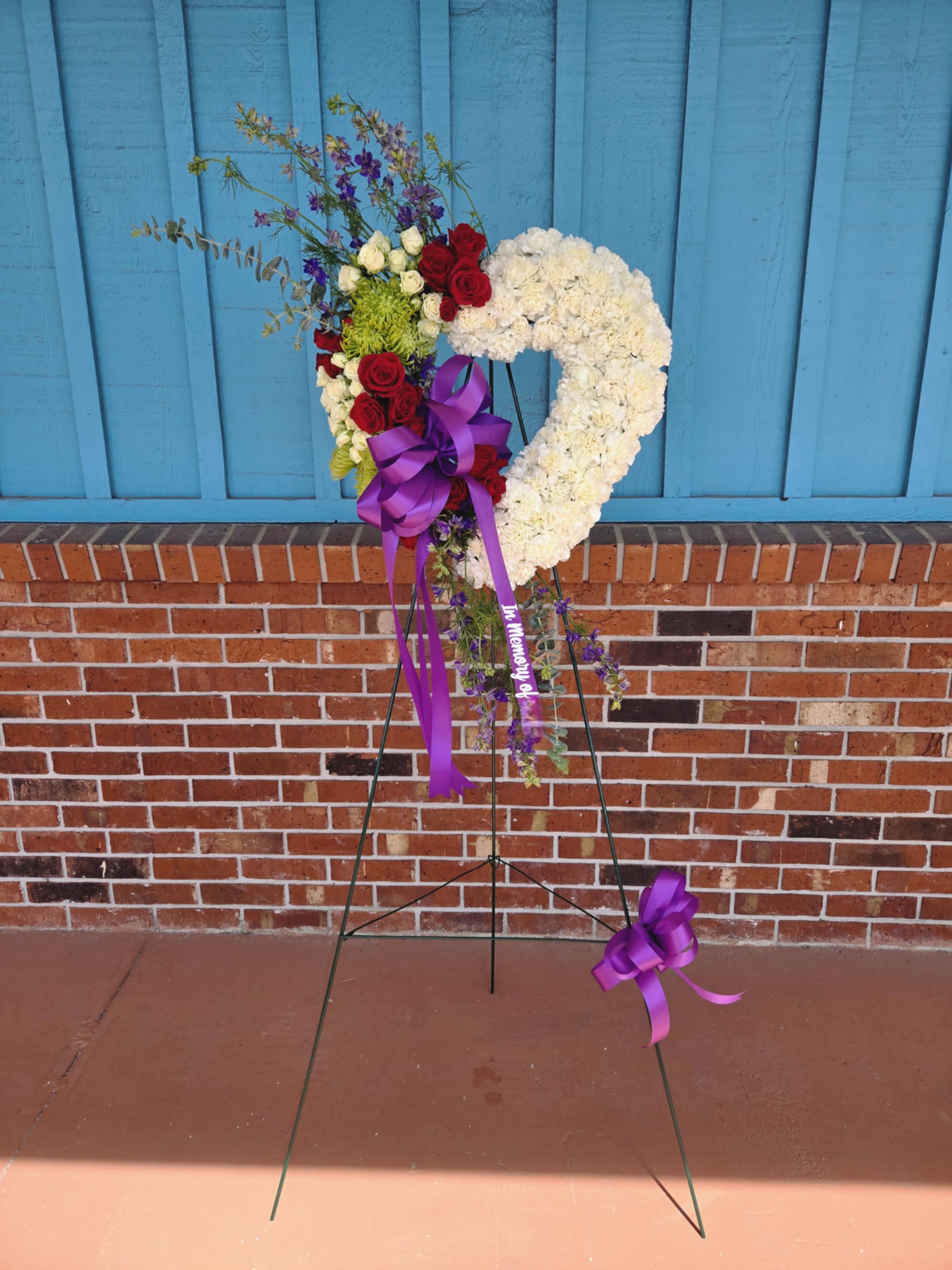 Send them away with your love. This 18" Open Heart standing spray makes for the perfect way to send love to the deceased and the family. *Ribbon will NOT include lettering* *Please Note* On Order Notes before Check Out, Please include the following: Name of Deceased The location of service...