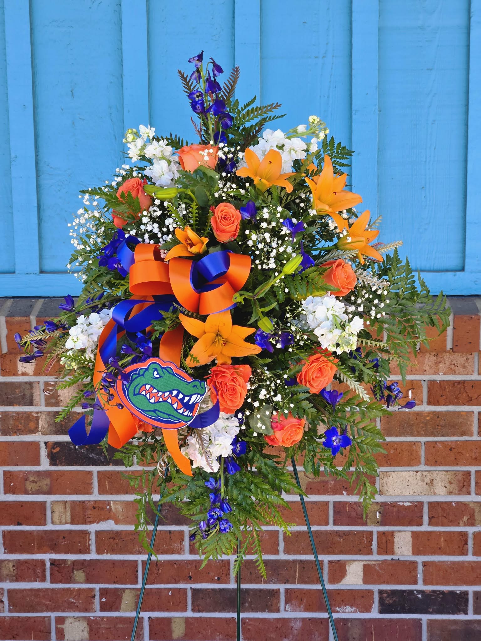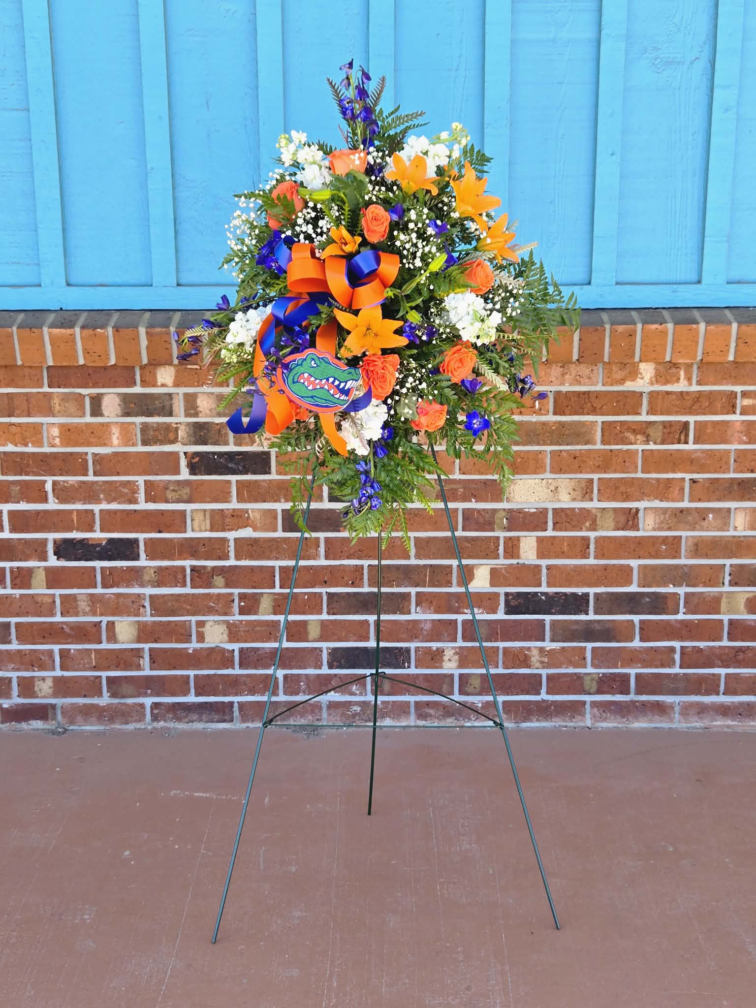 The perfect standing spray for the #1 Gators fan.  *Please Note* On Order Notes before Check Out, Please include the following: Name of Deceased The location of service and time (if available) Card Message  Flowers may Include: Orange Roses Orange Lilies Blue Delphinium White Stock Babies Breath Mixed Greenery Blue and...