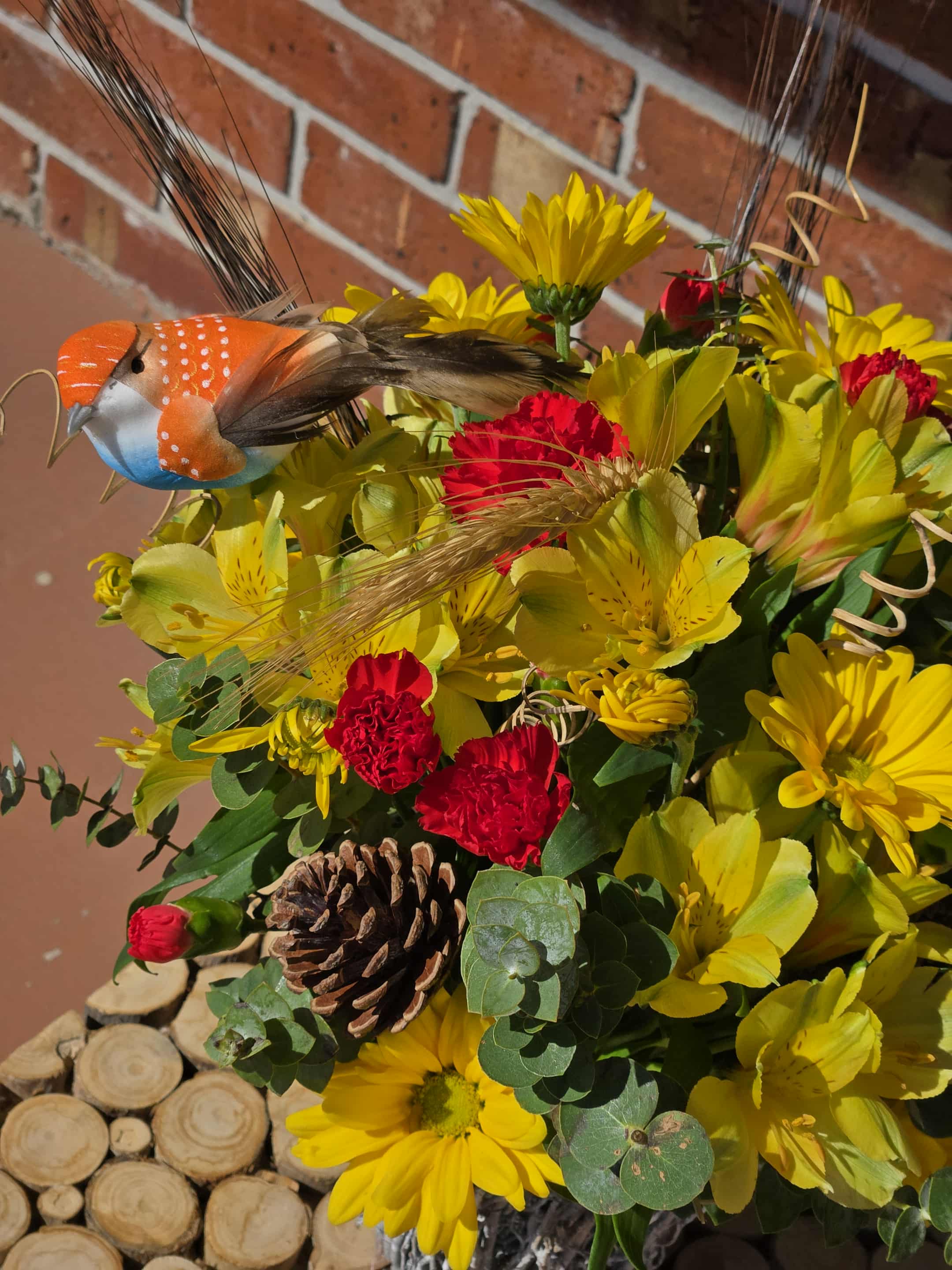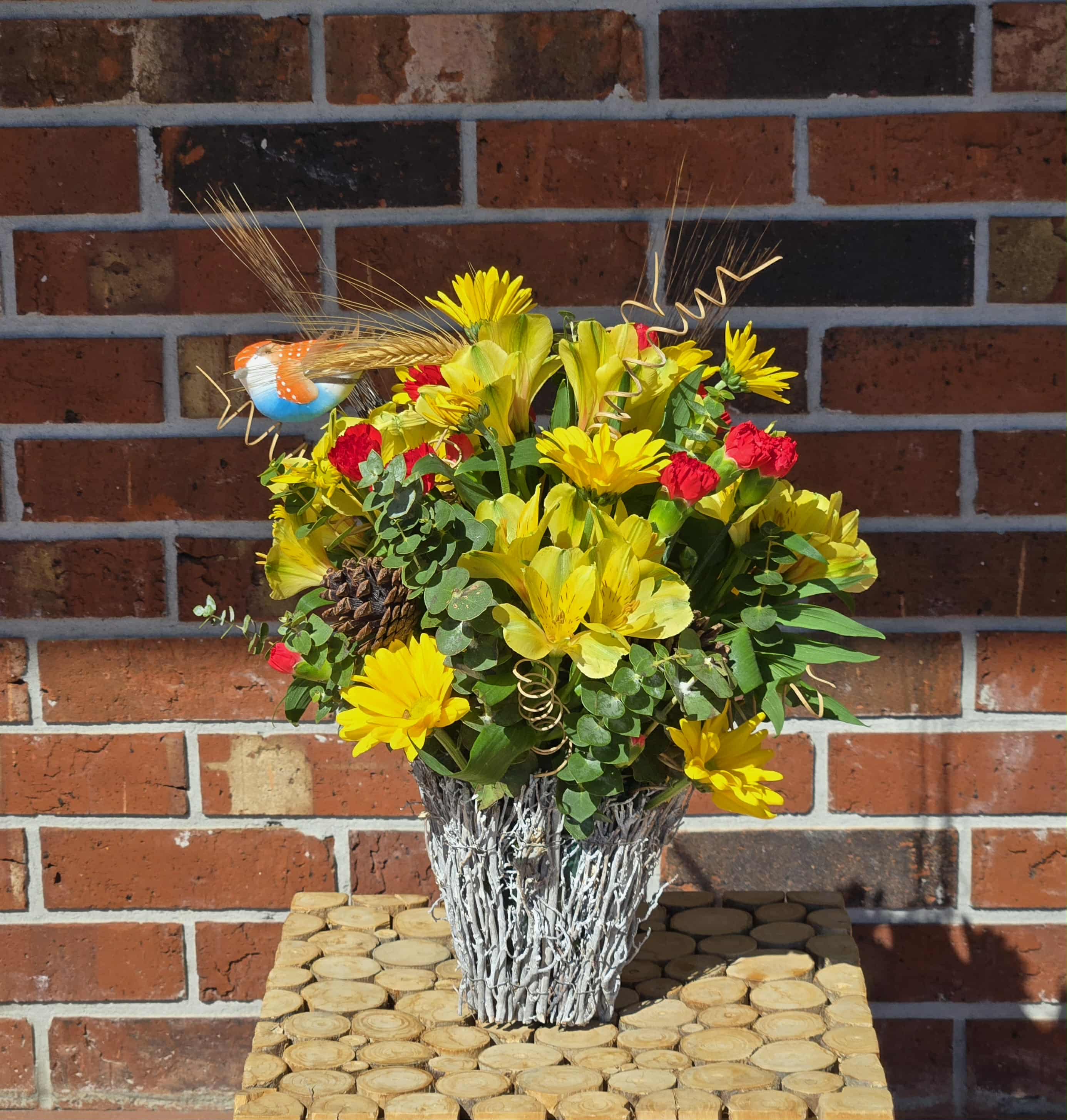Yellow blooms, pinecones and a rustic woodsy container blooming as if it were picked straight from a meadow. *Please Note* Flowers may Include: Yellow Alstroemeria Yellow Daisies Red Mini Carnations Dried Wheat Grass Mixed Greenery Assorted Rustic Decor Rustic Style Container The color and style of the arrangement may differ....
