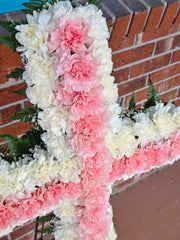 We are offering our Prayers and Peace unto the families and friends of passed loved ones. The Cross itself is a grand display of Pink and White Carnations on a bed of Babies Breath and Greenery.